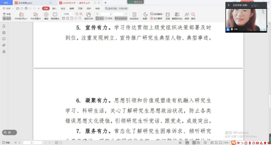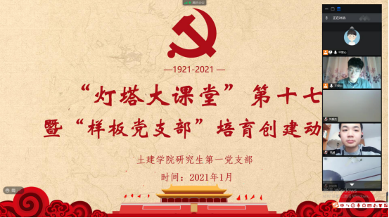 为进一步规范党支部的组织生活,提高支部党员的理论学习水平,深入推进“研究生样板党支部”的培育创建工作,确保党员队伍放假“不掉线”。1月28日下午,437ccm·必赢国际研究生第一党支部通过腾讯会议线上召开支部大会,集中组织学习了“灯塔大课堂”第十七讲,并就“研究生样板党支部”的创建工作作了动员,研究生第一党支部全体党员、学工办老师沈娇及部分入党积极分子代表参与了本次会议,会议由党支部书记韩一鸣主持。