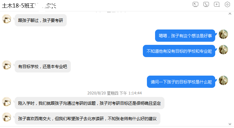 8月份,437ccm·必赢国际学生工作办公室各辅导员通过线上家长会、家长群、电话家访、微信一对一沟通等方式,根据学生具体情况和所处年级和时期,沟通了解学生在家期间的学习生活情况和生活动态,反馈学生在校期间表现,询问家长对学生的培养理念和期望,并给予建议。辅导员鲍娜娜在城乡规划和建筑学专业线上家长会上,向家长们介绍了2015级毕业班的就业与考研情况,并针对考研录取率背后折射出的原因和问题提醒家长们要根据学生实际学习状况规划合理目标、做出最佳选择。