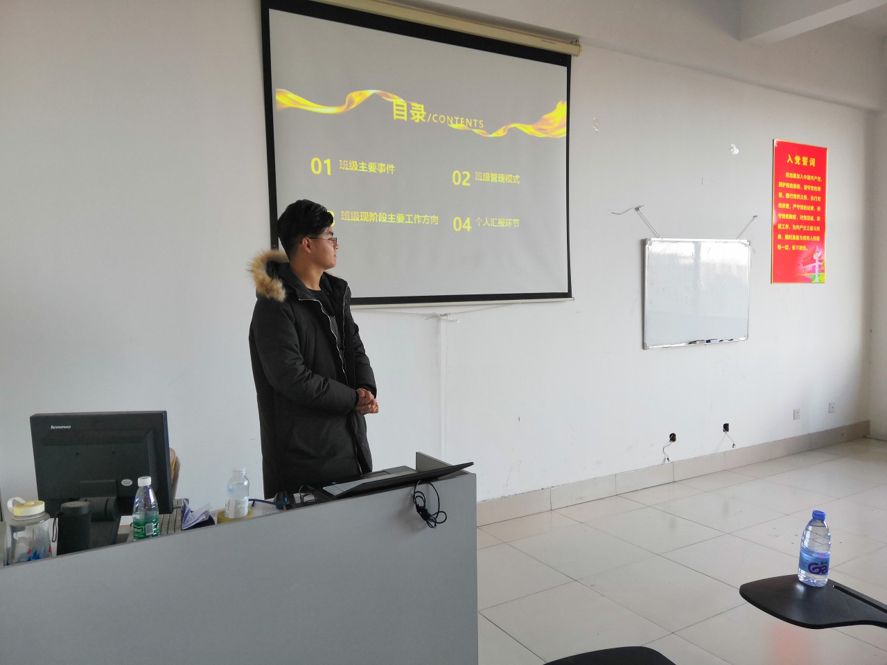 土木18-2班以“不忘初心,砥砺前行”为主题,一张张精美的PPT、一句句幽默的话语、一张张自信的面容,展现了同学们良好的精神风貌和对学习、工作认真负责的态度。土木18-5班使用先班委后班级成员的报告顺序,从班级主要事件、班级管理模式、班级现阶段主要工作方向等班级层面的汇报,到每位同学自身的反思、总结与展望,向老师和同学们展现了班级与个人共同蜕变的历程。工管18-1班以“反思过往,展望未来”为主题,从学而思、思而践、践而悟三个层次反思了自己的成长,增强了目标意识。
