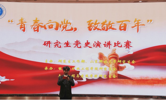 本次活动由研究生工作部、山东科技大学研究生会主办,土木工程与建筑学院研究生会、能源与矿业工程学院研究生会承办,比赛吸引了10个学院50余名研究生参加,参赛热情高涨。在初赛阶段共评选出了12名优秀选手进入决赛,决赛分为两轮,最终综合两轮成绩进行排名。第一轮结束后根据评委打分结果共有六位选手进入第二环节,第二环节六位选手根据赛前抽签得到的“党史关键词”展开即兴演讲,形式新颖、内容丰富。