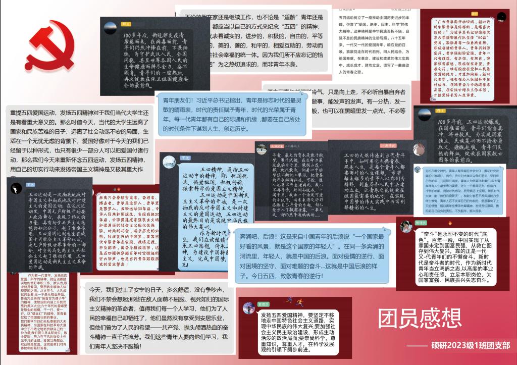 此外,学院通过线上形式组织各团支部开展了团课学习与感悟分享活动,青年学生在学习理论知识的过程中深刻领会“五四”精神的内涵,立志在担负时代使命的过程中建功新时代,勇做走在时代前列的奋进者、开拓者、奉献者。