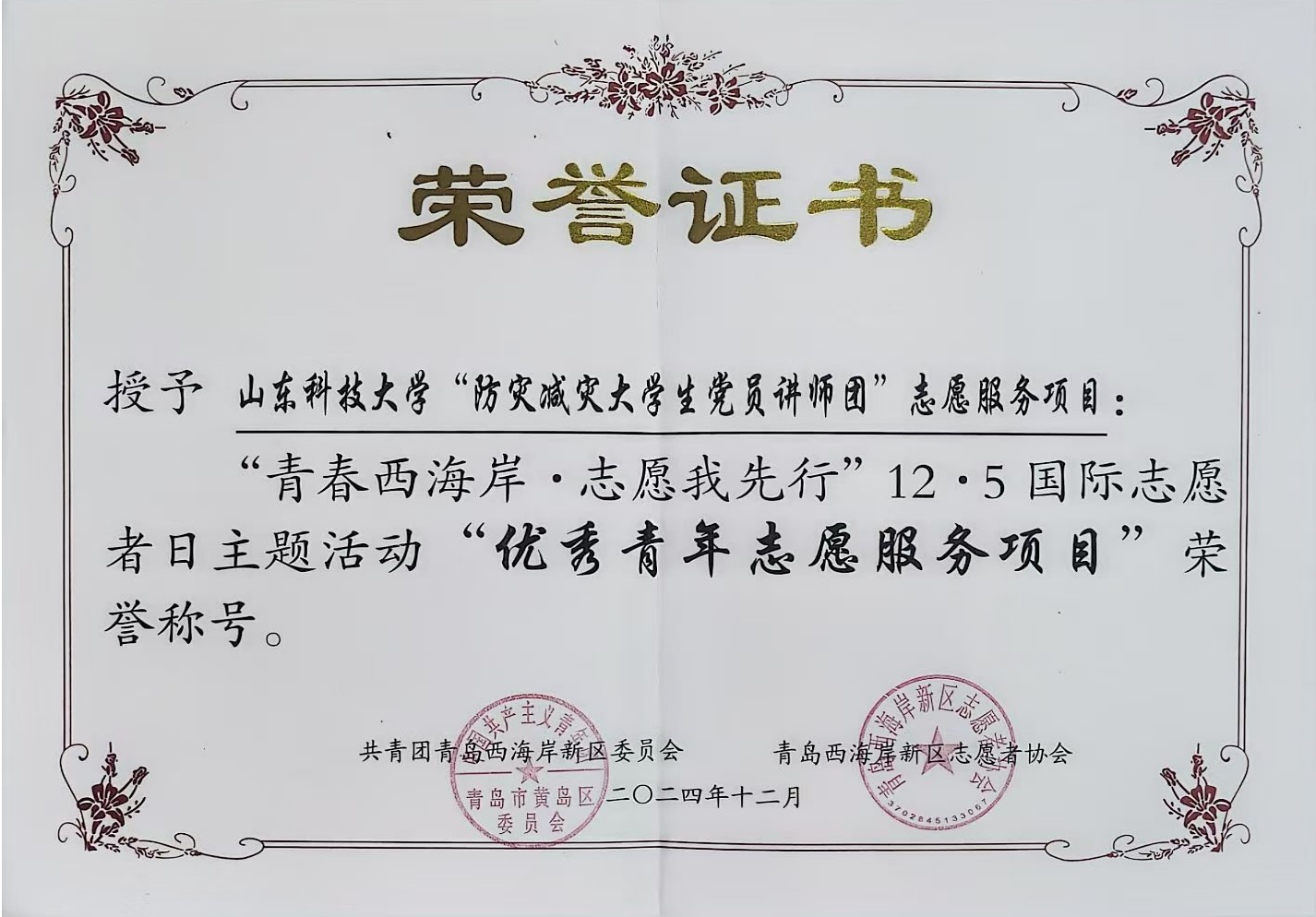 12月4日,在第39个国际志愿者日到来之际,西海岸新区团委举办“青春西海岸·志愿我先行”12·5国际志愿者日主题活动,表彰优秀青年志愿者、优秀青年志愿服务项目、优秀青年志愿服务工作者获奖代表以及驻区高校优秀青年大学生代表。437ccm·必赢国际防灾减灾大学生党员讲师团获“优秀青年志愿服务项目”荣誉称号,并作为唯一项目代表进行汇报展演。