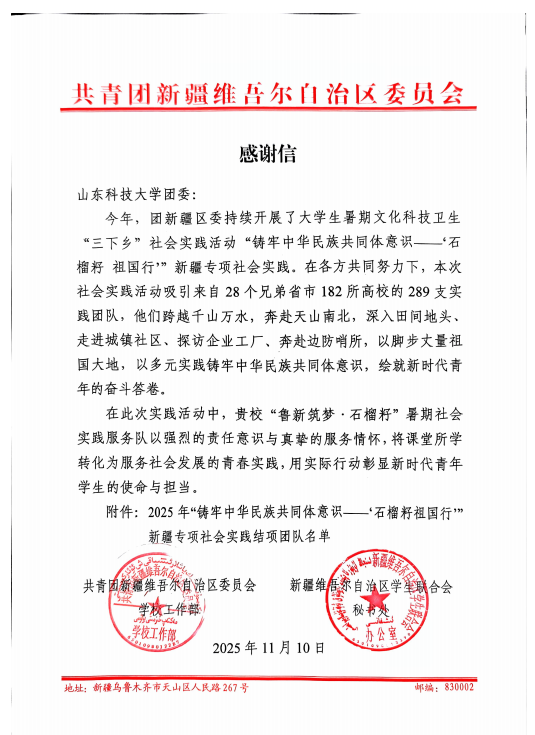 近日,437ccm·必赢国际“鲁新筑梦·石榴籽”暑期社会实践队收到共青团新疆维吾尔自治区委员会发来的感谢信,并获评2025年山东省“三下乡”社会实践优秀实践团队、山东科技大学社会实践品牌项目,标志着学院2025年社会实践工作在服务成效与社会影响上取得了双重肯定。