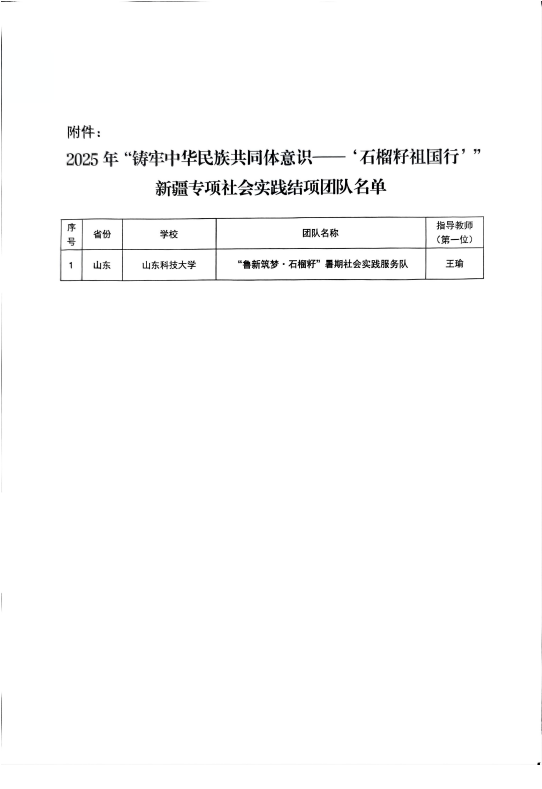 本次实践是共青团新疆区委开展的“铸牢中华民族共同体意识——‘石榴籽 祖国行’”新疆专项社会实践的重要组成部分。活动吸引了来自全国28个省市、182所高校的289支实践团队。在这样一场规模宏大、意义深远的实践中,山东科技大学“鲁新筑梦·石榴籽”服务队以强烈的责任意识与真挚的服务情怀脱颖而出。