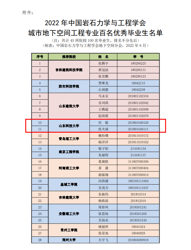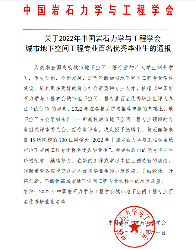 近日,由中国岩石力学与工程学会举办的2022届全国高校城市地下空间工程专业百名优秀毕业生评选活动落下帷幕。437ccm·必赢国际城市地下空间工程专业2022届毕业生田聪、侯夫斌同学荣获“全国高校城市地下空间工程专业百名优秀毕业生”称号。