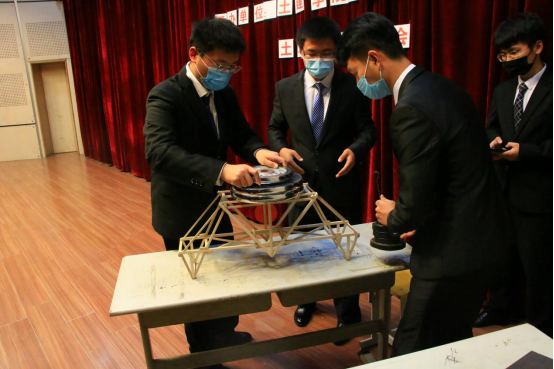 随后,比赛正式拉开帷幕,进入决赛的18组选手分别进行了现场展示及加载。第一轮进行的是非专业组的模型展示。本次非专业组比赛以“我心目中的科大剧院”为设计命题,选手们用不同的原料,精巧的结构设计,独特的创意思维,设计出一个个造型独特又注重建筑结构的作品。随后,进行了专业组桥结构模型的展示及加载。本次专业组比赛以“某运河主干跨河桥”为主题。工作人员分别对模型的承重部位进行静荷载和冲击荷载的试验。评委们对每组作品进行提问并提出优化建议。