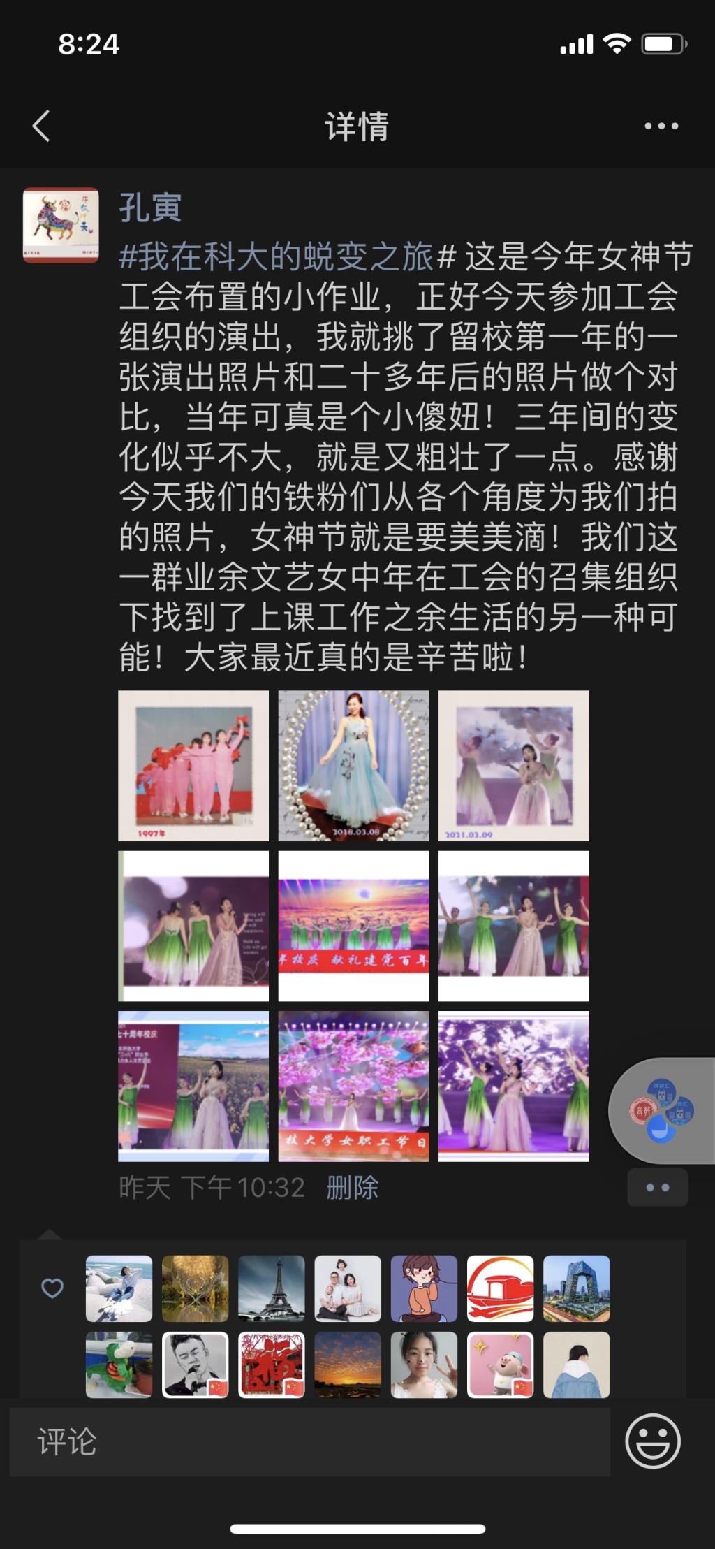 学院女教职工整理自入职科大以来个人或者学校景物的变化照片,按照年份顺序发送朋友圈,配上含有“#心归科大,蜕变之旅#”的心路历程。四季更替,岁月沉淀,女教职工在科大逐渐蜕变成蝶。教苑群芳,女教职工讲台上做最美园丁,传道授业,讲台下是百变女神,绽放魅力。